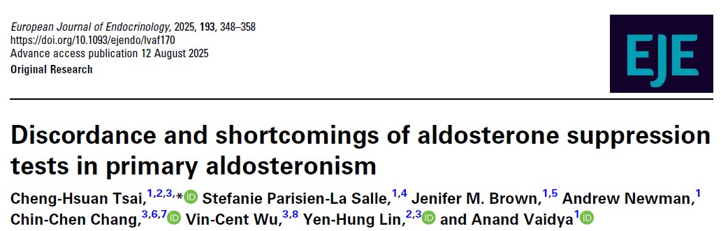 2025: Cheng-Hsuan Tsai's publication demonstrates the limitations of using aldosterone suppression tests to accurately diagnose and subtype primary aldosteronism in the European Journal of Endocrinology.